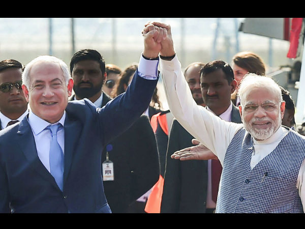 ನವದೆಹಲಿ, ಜನವರಿ 14:ಇಸ್ರೇಲ್ ಪ್ರಧಾನಿ ಬೆಂಜಮಿನ್ ನೇತನ್ಯಾಹು ಹಾಗೂ ಅವರ ಪತ್ನಿ ನಾಲ್ಕು ದಿನಗಳ ಪ್ರವಾಸಕ್ಕಾಗಿ ಭಾನುವಾರದಂದು ಭಾರತಕ್ಕೆ ಬಂದಿದ್ದಾರೆ. ಪ್ರಧಾನಿ ನರೇಂದ್ರ ಮೋದಿ ಅವರು ಖುದ್ದು ವಿಮಾನ ನಿಲ್ದಾಣಕ್ಕೆ ತೆರಳಿ, ಇಸ್ರೇಲ್ ಪ್ರಧಾನಿ ಅವರನ್ನು ಬರ ಮಾಡಿಕೊಂಡಿದ್ದಾರೆ.