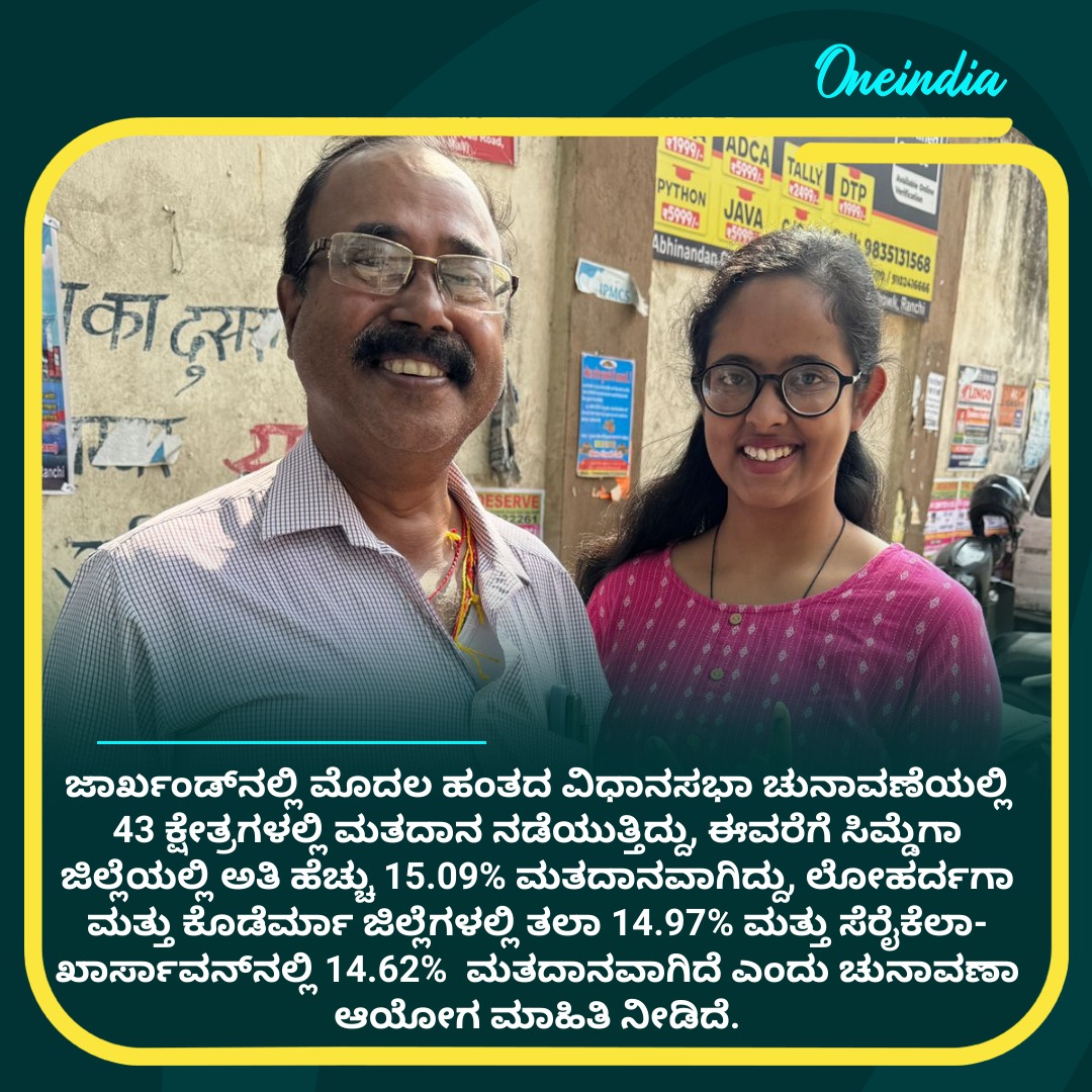 ಜಾರ್ಖಂಡ್ನಲ್ಲಿ ಮೊದಲ ಹಂತದ ವಿಧಾನಸಭಾ ಚುನಾವಣೆಯಲ್ಲಿ 43 ಕ್ಷೇತ್ರಗಳಲ್ಲಿ ಮತದಾನ ನಡೆಯುತ್ತಿದ್ದು, ಈವರೆಗೆ ಸಿಮ್ಡೆಗಾ ಜಿಲ್ಲೆಯಲ್ಲಿ ಅತಿ ಹೆಚ್ಚು 15.09% ಮತದಾನವಾಗಿದ್ದು, ಲೋಹರ್ದಗಾ ಮತ್ತು ಕೊಡೆರ್ಮಾ ಜಿಲ್ಲೆಗಳಲ್ಲಿ ತಲಾ 14.97% ಮತ್ತು ಸೆರೈಕೆಲಾ-ಖಾರ್ಸಾವನ್ನಲ್ಲಿ 14.62% ಮತದಾನವಾಗಿದೆ ಎಂದು ಚುನಾವಣಾ ಆಯೋಗ ಮಾಹಿತಿ ನೀಡಿದೆ.