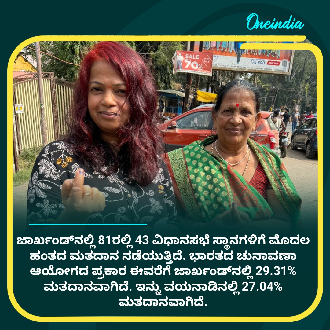 ಜಾರ್ಖಂಡ್ನಲ್ಲಿ 81ರಲ್ಲಿ 43 ವಿಧಾನಸಭೆ ಸ್ಥಾನಗಳಿಗೆ ಮೊದಲ ಹಂತದ ಮತದಾನ ನಡೆಯುತ್ತಿದೆ. ಭಾರತದ ಚುನಾವಣಾ ಆಯೋಗದ ಪ್ರಕಾರ ಈವರೆಗೆ ಜಾರ್ಖಂಡ್ನಲ್ಲಿ 29.31% ಮತದಾನವಾಗಿದೆ. ಇನ್ನು ವಯನಾಡಿನಲ್ಲಿ 27.04% ಮತದಾನವಾಗಿದೆ.