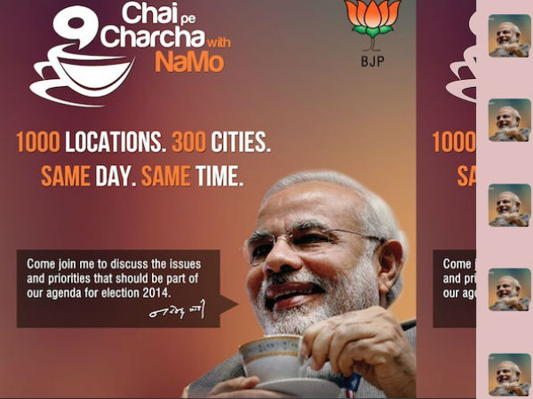ನಾಳೆ ಫೆ. 1ರಂದು ಗಾಂಧಿನಗರದಲ್ಲಿ 'ಮೋದಿ ಚಹಾ ಚರ್ಚೆ' ಹವಾ ಎಬ್ಬಿಸುವ ಮೋದಿ, 300 ಲೋಕಸಭಾ ಕ್ಷೇತ್ರಗಳ ವ್ಯಾಪ್ತಿಯಲ್ಲಿ 1,000 ಚಹಾ ಅಂಗಡಿಗಳ ಬಳಿ ಜಮಾಯಿಸುವ ಜನರ ಜತೆ ನೇರವಾಗಿ ಮಾತನಾಡಲಿದ್ದಾರೆ. ಇದಕ್ಕಾಗಿ ಇಂಟರ್ನೆಟ್ ಮತ್ತು ಡಿಟಿಎಚ್ ತಂತ್ರಜ್ಞಾನ ಬಳಕೆಯಾಗಲಿದೆ ಎಂದು ಬಿಜೆಪಿ ಪ್ರಧಾನಿ ಅಭ್ಯರ್ಥಿಯ ಪ್ರಚಾರ ಸಮಿತಿಯ ಸದಸ್ಯರೊಬ್ಬರು ತಿಳಿಸಿದ್ದಾರೆ. ಮೋದಿ ಅವರು 5 ಚಾಯ್ (nukkad) ಅಡ್ಡಾಗಳಲ್ಲಿ Chai pe charcha with NaMo ಅಂದರೆ 'ಚಹಾ ಮಾರಾಟಗಾರರ ಜತೆ ಸಂವಾದವನ್ನು ನಡೆಸಲಿದ್ದಾರೆ.