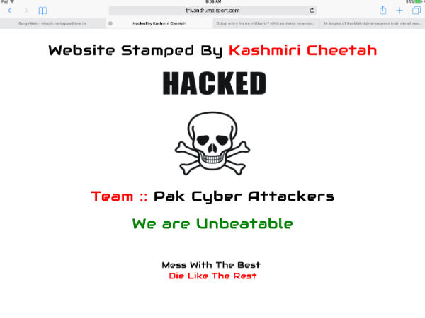 ತಿರುವನಂತಪುರಂ, ಡಿಸೆಂಬರ್ 28: ಕೊಚ್ಚಿನ್ ಹಾಗೂ ತಿರುವನಂತಪುರಂನ ವಿಮಾನ ನಿಲ್ದಾಣಗಳ ವೆಬ್ ಸೈಟ್ ಗೆ ಕನ್ನ ಹಾಕಲಾಗಿದೆ. ಪಾಕಿಸ್ತಾನದ ಸೈಬರ್ ದಾಳಿಕೋರರ ಕೃತ್ಯ ಎಂದು ಸಂದೇಶ ರವಾನಿಸಲಾಗಿದೆ. ಈ ವೆಬ್ ಸೈಟ್ ಗೆ ಕನ್ನ ಹಾಕಿರುವುದು ಕಾಶ್ಮೀರಿ ಚೀತಾ ಎಂಬ ಒಕ್ಕಣೆಯೂ ಇದೆ.