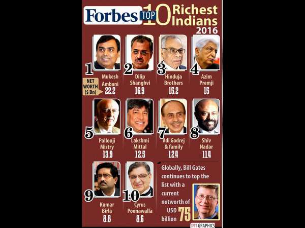 ರಿಲಾಯನ್ಸ್ ಸಮೂಹ ಸಂಸ್ಥೆಗಳ ಮುಖ್ಯಸ್ಥ ಮುಖೇಶ್ ಅಂಬಾನಿ ಕಳೆದ ಎಂಟು ಬಾರಿಯೂ ದೇಶದ ಶ್ರೀಮಂತರ ಪಟ್ಟಿಯಲ್ಲಿ ಅಗ್ರಸ್ಥಾನದಲ್ಲಿದ್ದರು. ಕಳೆದ ವರ್ಷ 18.9 ಬಿಲಿಯನ್ ಡಾಲರ್ ಆಸ್ತಿ ಮೌಲ್ಯ ಹೊಂದಿದ್ದರು. ಆದರೆ ಈ ವರ್ಷ ಮುಖೇಶ್ ಅಂಬಾನಿ ಅವರ ಆಸ್ತಿ 22.7 ಬಿಲಿಯನ್ ಡಾಲರ್ ಗೆ ಏರಿಕೆಯಾಗಿದೆ . ಇವರು ತಮ್ಮ ಆಸ್ತಿಯ ಶೇ.21 ರಷ್ಟು ರಿಲಾಯನ್ಸ್ ಇಂಡಸ್ಟ್ರೀಸ್ ಗೆ ಹೂಡಿಕೆ ಮಾಡಿದ್ದಾರೆ.