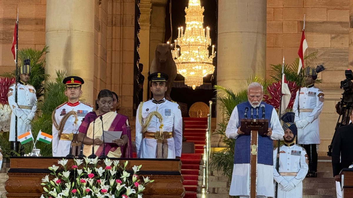 ಎನ್ಡಿಎ ಮೈತ್ರಿಕೂಟದ ನಾಯಕರಾಗಿ ಆಯ್ಕೆಯಾಗಿದ್ದ ನರೇಂದ್ರ ಮೋದಿ (73) ಅವರಿಗೆ ರಾಷ್ಟ್ರಪತಿ ದ್ರೌಪದಿ ಮುರ್ಮು ಸರ್ಕಾರ ರಚನೆ ಮಾಡಲು ಆಹ್ವಾನ ನೀಡಿದ್ದರು. ಭಾನುವಾರ ರಾಷ್ಟ್ರಪತಿ ಭವನದಲ್ಲಿ ನಡೆದ ಸಮಾರಂಭದಲ್ಲಿ ದ್ರೌಪದಿ ಮುರ್ಮು ನರೇಂದ್ರ ಮೋದಿ ಅವರಿಗೆ ಪ್ರಮಾಣ ವಚನ ಬೋಧಿಸಿದರು.