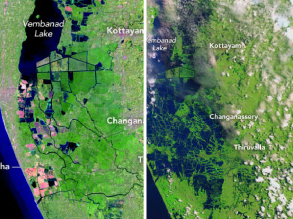 ಉಪಗ್ರಹದ ಕಣ್ಣಲ್ಲಿ ದೇವರನಾಡು ಕೇರಳ ಪ್ರವಾಹಕ್ಕೂ ಮುನ್ನ ಮತ್ತು ಪ್ರವಾಹದ ನಂತರ ಹೇಗೆ ಕಾಣುತ್ತಿತ್ತು ಎಂಬುದು ನಾಸಾದ ಚಿತ್ರದಿಂದ ತಿಳಿದುಬಂದಿದೆ.