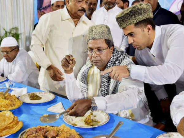 ರಂಜಾನ್ ಪ್ರಯುಕ್ತ ಗುರುವಾರ ಬೆಂಗಳೂರಿನ ಅರಮನೆ ಮೈದಾನದಲ್ಲಿ ಇಫ್ತಾರ್ ಕೂಟ ಆಯೋಜಿಸಲಾಗಿತ್ತು. ಚಿತ್ರದಲ್ಲಿ ಸಚಿವ ರೋಷನ್ ಬೇಗ್ ಕೂಡ ಇದ್ದಾರೆ. 'ಅಲ್ಲಿದೆ ನೋಡಿ, ಅದನ್ನು ತಿನ್ನಿ' ಎಂದು ಮುಖ್ಯಮಂತ್ರಿ ಸಿದ್ದರಾಮಯ್ಯ ಅವರಿಗೆ ಹೇಳುತ್ತಿರುವಂತಿದೆ.