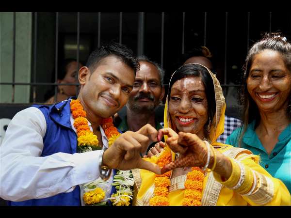 ಆಸಿಡ್ ದಾಳಿ ಸಂತ್ರಸ್ತೆ ಲಲಿತಾ ಅಶೋಕ್ ಬೆನ್ ಬನ್ಸಿ ಎಂಬಾಕೆಯನ್ನು ರವಿ ಸಿಂಗ್ ಮುಂಬೈನ ಥಾಣೆಯಲ್ಲಿ ಮದುವೆಯಾದ ನಂತರ ನವದಂಪತಿ ಪ್ರೇಮದ ಚಿಹ್ನೆಯನ್ನು ತೋರಿದ ರೀತಿಯಿದು.