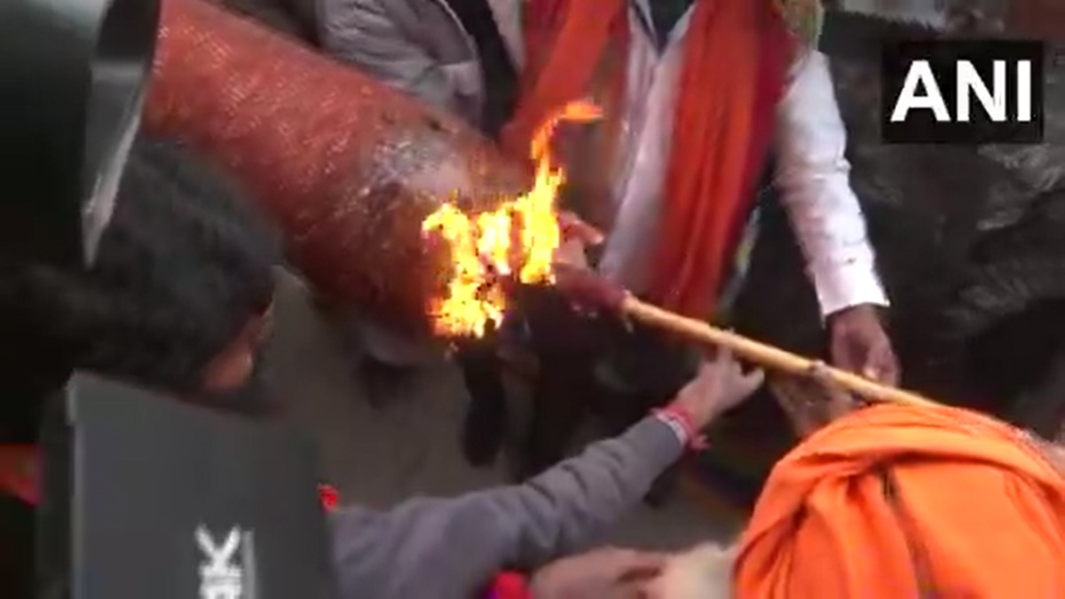 #WATCH | The 108-feet incense stick, that reached from Gujarat, was lit in the presence of Shri Ram Janmabhoomi Teerth Kshetra President Mahant Nrityagopal Das ji Maharaj pic.twitter.com/ftQZBgjaXt