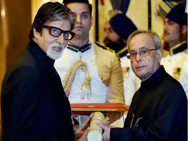 ಹಿಂದಿ ಚಿತ್ರರಂಗದ ಶೆಹೆನ್ಷಾ ಅಮಿತಾಬ್ ಬಚ್ಚನ್ ಅವರಿಗೆ ಪ್ರಣಬ್ ಮುಖರ್ಜಿ ಅವರು ಪದ್ಮ ವಿಭೂಷಣ ಪ್ರಶಸ್ತಿ ಪ್ರದಾನ ಮಾಡುತ್ತಿರುವುದು. ಅಮಿತಾಭ್ ಅವರಿಗೆ 1984ರಲ್ಲಿ ಪದ್ಮಶ್ರೀ ಮತ್ತು 2001ರಲ್ಲಿ ಪದ್ಮ ಭೂಷಣ ಪ್ರಶಸ್ತಿ ದೊರೆತಿತ್ತು.