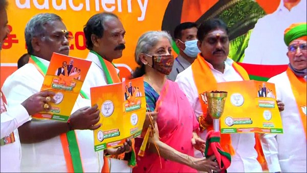 ಪುದುಚೇರಿ, ಮಾರ್ಚ್ 26: ಹಣಕಾಸು ಸಚಿವೆ ನಿರ್ಮಲಾ ಸೀತಾರಾಮನ್ ಇಂದು ಪುದುಚೇರಿ ಚುನಾವಣೆಗೆ ಬಿಜೆಪಿಯ ಚುನಾವಣಾ ಪ್ರಣಾಳಿಕೆ ಬಿಡುಗಡೆ ಮಾಡಿದರು.