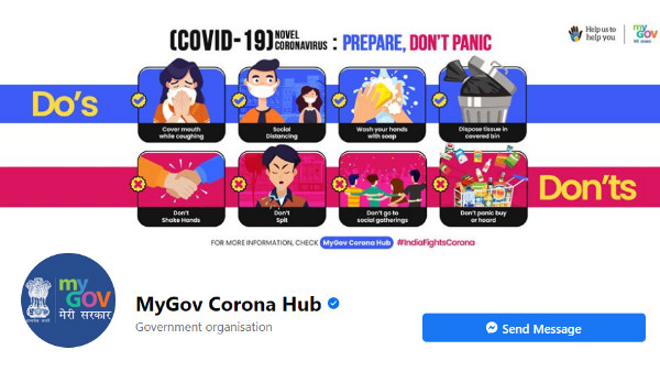 MyGov Corona Hub-ಎಂದು ಫೇಸ್ಬುಕ್ ನಲ್ಲಿ ಸರ್ಚ್ ಮಾಡಿದರೆ ಈ ಪುಟ ಸಿಗಲಿದೆ. ಫೇಸ್ಬುಕ್ ಸಹಾಯಕೇಂದ್ರ ಎಂದು ಇದನ್ನು ಭಾವಿಸಬಹುದು. ಕೋವಿಡ್19 ಕುರಿತ ಮಾಹಿತಿ ಪಡೆಯಲು ಇದನ್ನು ಸಾರ್ವಜನಿಕರು ಬಳಸಬಹುದು ಎಂದು MyGov ನ ಸಿಇಒ ಅಭಿಷೇಕ್ ಸಿಂಗ್ ತಿಳಿಸಿದ್ದಾರೆ. ಇನ್ನೇಕೆ ತಡ ಫೇಸ್ಬುಕ್ ಪುಟಕ್ಕೆ ಲಗ್ಗೆ ಇಟ್ಟು ಮಾಹಿತಿ ಪಡೆದುಕೊಳ್ಳಿ.. ಫೇಸ್ಬುಕ್ ಹೆಲ್ಪ್ ಡೆಸ್ಕ್ ಲಿಂಕ್ ಇಲ್ಲಿದೆ