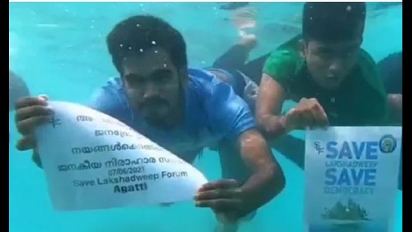 ಲಕ್ಷದ್ವೀಪದ ಆಡಳಿತಾಧಿಕಾರಿ ಪ್ರಫುಲ್ ವಿರುದ್ಧ ನೀರಿನೊಳಗೆ ಭಿತ್ತಿಪತ್ರ ಹಿಡಿದು ವಿಭಿನ್ನ ಪ್ರತಿಭಟನೆ