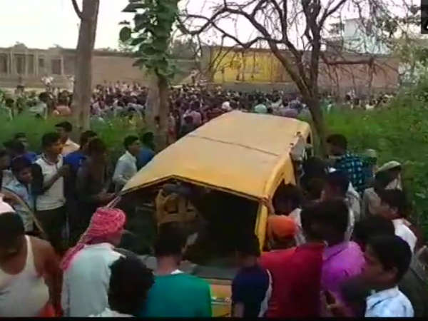 #SpotVisuals: 11 school students dead after the vehicle they were travelling in collided with a train at an unmanned crossing in Kushinagar. pic.twitter.com/k49UvEcEaT