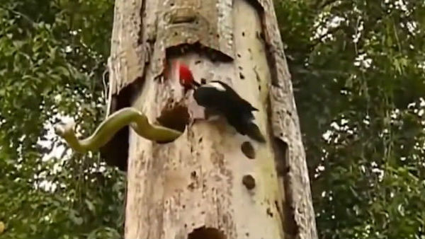 ವಿಡಿಯೋ: ಮರಿಯನ್ನು ರಕ್ಷಿಸಲು ಹಾವಿನೊಂದಿಗೆ ಸೆಣಸಾಡಿದ ಮರಕುಟಿಕ
