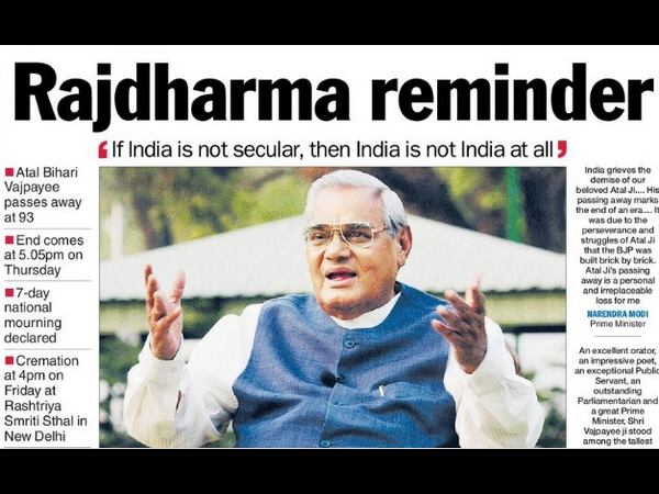 ಸದಾ ತನ್ನ ಚುರುಕಾದ ಕುಟುಕುವ ತಲೆಬರಹದಿಂದ ಖ್ಯಾತವಾಗಿರುವ ಟೆಲಿಗ್ರಾಫ್ ಪತ್ರಿಕೆ ವಾಜಪೇಯಿ ಅವರ ನಿಧನಕ್ಕೆ ಅದ್ಬುತ ಹೆಡ್ಲೈನ್ ನೀಡಿದೆ. ಪ್ರಸ್ತುತ ರಾಜಕೀಯಕ್ಕೂ ಸಲ್ಲುವಂತೆ 'ರಾಜಧರ್ಮ ರಿಮೈಂಡರ್' (ರಾಜಧರ್ಮ ನೆನಪಿಸುವಾತ) ಎಂದು ತಲೆ ಬರಹ ನೀಡಿದೆ. ತಮ್ಮದೇ ಪಕ್ಷದ ಮೋದಿಗೆ ರಾಜಧರ್ಮ ಪಾಲಿಸುವಂತೆ ಅಟಲ್ ಜೀ ಹೇಳಿದ್ದು ಆಗ ಬಹುದೊಡ್ಡ ಸುದ್ದಿಯಾಗಿತ್ತು.