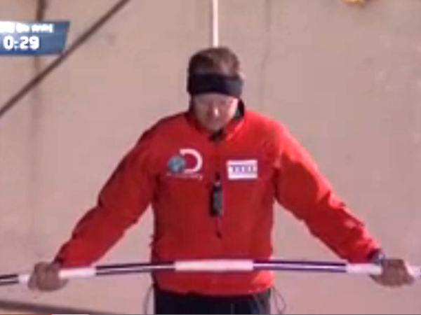 ತುದಿಗೂ ನದಿಯಾಚಿಗಿನ ಇನ್ನೊಂದು ಕಟ್ಟಡದ ತುದಿಗೂ ಕಟ್ಟಲಾದ 454 ಅಡಿ(138 ಮೀಟರ್) ಉದ್ದದ ಬಿಗಿಹಗ್ಗದ ಮೇಲೆ ನಡಿಗೆಯನ್ನು ಪೂರ್ಣಗೊಳಿಸಲು ಕೇವಲ ಆರೂವರೆ ನಿಮಿಷಗಳ ಸಮಯ ತೆಗೆದುಕೊಂಡರು.