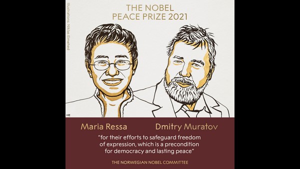 ಅಂತಾರಾಷ್ಟ್ರೀಯ, ಅಕ್ಟೋಬರ್ 8: ಫಿಲಿಪೈನ್ಸ್ ಪತ್ರಕರ್ತೆ ಮರಿಯಾ ರೆಸ್ಸಾ ಮತ್ತು ರಷ್ಯಾದ ಪತ್ರಕರ್ತ ಡಿಮಿಟ್ರಿ ಮುರಾಟೋವ್ 2021ನೇ ಸಾಲಿನ ನೊಬೆಲ್ ಶಾಂತಿ ಪ್ರಶಸ್ತಿಗೆ ಭಾಜನರಾಗಿದ್ದಾರೆ.