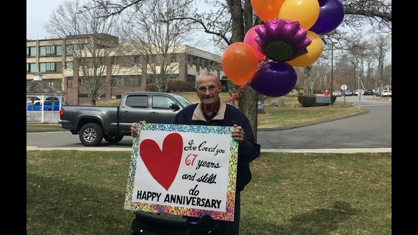 ನರ್ಸಿಂಗ್ ಹೋಮ್ ಮುಂದೆ ಕುಳಿತುಕೊಂಡ ಬಾಬ್ ಶೆಲ್ಲಾರ್ಡ್ ''67 ವರ್ಷದಿಂದ ಪ್ರೀತಿಸುತ್ತಿದ್ದೇನೆ, ಈಗಲೂ ಪ್ರೀತಿಸುತ್ತೇನೆ. ವಿವಾಹ ವಾರ್ಷಿಕೋತ್ಸವದ ಶುಭಾಶಯಗಳು (I've loved you 67 years and still do. Happy Anniversary) ಎಂದು ಬರೆದು ಪತ್ನಿಗೆ ತೋರಿಸುವ ಪ್ರಯತ್ನ ಮಾಡಿದ್ದಾರೆ.