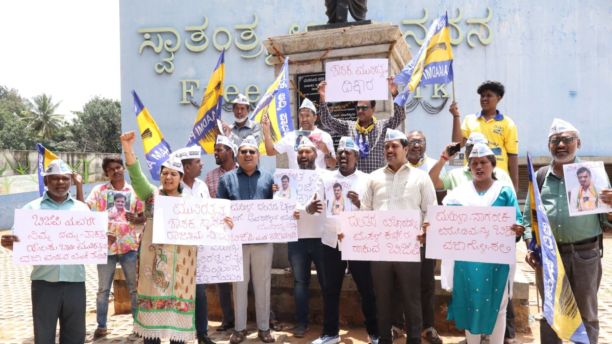 ಬೆಂಗಳೂರು, ಸೆಪ್ಟೆಂಬರ್ 16: ಜಾತಿನಿಂದನೆ ಮತ್ತು ಬಿಬಿಎಂಪಿಯ ಘನತ್ಯಾಜ್ಯ ವಿಲೇವಾರಿ ಗುತ್ತಿಗೆದಾರರಿಂದ ಲಂಚಕ್ಕೆ ಬೇಡಿಕೆ ಇಟ್ಟ ಆರೋಪದಡಿ ಬಂಧಿಸಲಾಗಿರುವ ಬಿಜೆಪಿ ಶಾಸಕ ಮುನಿರತ್ನ ಅವರನ್ನು ಆ ಸ್ಥಾನದಿಂದ ವಜಾಗೊಳಿಸಬೇಕು ಎಂದು ಆಗ್ರಹಿಸಿ ಆಮ್ ಆದ್ಮಿ ಪಕ್ಷದ ಬೆಂಗಳೂರು ನಗರ ಘಟಕದ ಕಾರ್ಯಕರ್ತರು ಸ್ವಾತಂತ್ರ್ಯ ಉದ್ಯಾನದಲ್ಲಿ ಸೋಮವಾರ ಪ್ರತಿಭಟನೆ ನಡೆಸಿದರು.