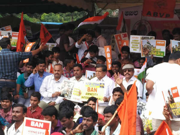 ಬೆಂಗಳೂರಿನ ಮೌರ್ಯ ಸರ್ಕಲ್ ಬಳಿ ಅಖಿಲ ಭಾರತೀಯ ವಿದ್ಯಾರ್ಥಿ ಪರಿಷತ್ ಕಾರ್ಯಕರ್ತರು 48 ಗಂಟೆಗಳ ಅಹೋರಾತ್ರಿ ಧರಣಿ ನಡೆಸುತ್ತಿದ್ದಾರೆ. ಆಮ್ನೆಸ್ಟಿ ಇಂಟರ್ ನ್ಯಾಷನಲ್ ಇಂಡಿಯಾ ಸಂಸ್ಥೆ ವಿರುದ್ಧ ಕ್ರಮ ಕೈಗೊಳ್ಳಬೇಕು ಎಂದು ಒತ್ತಾಯಿಸುತ್ತಿದ್ದಾರೆ. ಈ ಪ್ರತಿಭಟನೆಗೆ ಬಿಜೆಪಿ ಬೆಂಬಲ ಕೊಟ್ಟಿದೆ.[Amnesty International India ಪರಿಚಯ]
