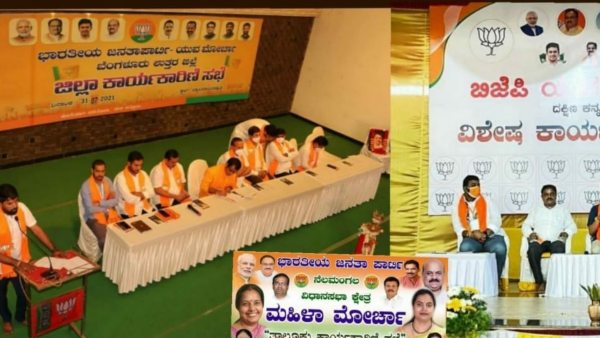 ಯಶವಂತಪುರ ಮಂಡಲ ಮಹಿಳಾ ಮೋರ್ಚಾ ಹಾಗೂ ಬೆಂಗಳೂರು ಉತ್ತರ ಜಿಲ್ಲಾ ಬಿಜೆಪಿ ಯುವ ಮೋರ್ಚಾ ಕಾರ್ಯಕಾರಣಿ ಸಭೆಗಳು ಶನಿವಾರ ನಡೆದವು. ಈ ಎರಡೂ ಸಭೆಗಳ ವೇದಿಕೆಯಲ್ಲಿ ಅಳವಡಿಸಲಾಗಿದ್ದ ಬ್ಯಾನರ್ನಲ್ಲಿ ಯಡಿಯೂರಪ್ಪ ಭಾವಚಿತ್ರವೇ ಇರಲಿಲ್ಲ.