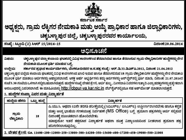 ಒಟ್ಟು 18 ಹುದ್ದೆಗಳು ಖಾಲಿ ಇವೆ. ಇವುಗಳನ್ನು ಭರ್ತಿ ಮಾಡಲು ಅಧ್ಯಕ್ಷರು, ಗ್ರಾಮಲೆಕ್ಕಿಗರ ನೇಮಕಾತಿ ಮತ್ತು ಆಯ್ಕೆ ಪ್ರಾಧಿಕಾರ ಹಾಗೂ ಜಿಲ್ಲಾಧಿಕಾರಿಗಳು, ಚಿಕ್ಕಬಳ್ಳಾಪುರ ಇವರು ಆನ್ ಲೈನ್ ಮೂಲಕ ಅರ್ಹ ಅಭ್ಯರ್ಥಿಗಳಿಂದ ಅರ್ಜಿ ಆಹ್ವಾನಿಸಿದ್ದಾರೆ. ಮೀಸಲಾತಿ ವರ್ಗೀಕರಣವೂ ಇದೆ.