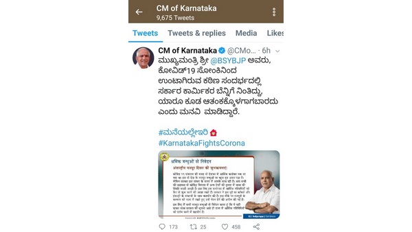 ಹಿಂದಿ ಭಾಷೆಯಲ್ಲಿ ಸಿಎಂ ಟ್ವೀಟ್, ನೆಟ್ಟಿಗರಿಂದ ವಿರೋಧ: ಕಾರ್ಮಿಕ ದಿನಾಚರಣೆ ಹಿನ್ನೆಲೆಯಲ್ಲಿ ಶ್ರಮಿಕರಲ್ಲಿ ಭರವಸೆ ತುಂಬಲು ಮುಖ್ಯಮಂತ್ರಿ ಮುಖ್ಯಮಂತ್ರಿ ಯಡಿಯೂಪ್ಪ ಟ್ವೀಟ್ ಮಾಡಿದ್ದಾರೆ. ಆದರೆ ಹಿಂದಿ ಭಾಷೆಯಲ್ಲಿ ಟ್ವೀಟ್ ಮಾಡಿದ್ದನ್ನು ಹಲವು ಕನ್ನಡಿಗರು ಪ್ರಶ್ನೆ ಮಾಡಿದ್ದಾರೆ. ಕನ್ನಡಿಗರ ಮೇಲೆ ಹಿಂದಿ ಹೇರಿಕೆ ಮಾಡಲಾಗಿದೆ ಎಂದು ಟ್ವಿಟ್ಟಿಗರು ಪರ-ವಿರೋಧದ ಚರ್ಚೆ ನಡೆಸಿದ್ದಾರೆ. ನೆಟ್ಟಿಗರು ಮಾಡಿರುವ ಟ್ವೀಟ್ಗಳು ಹೀಗಿವೆ:
