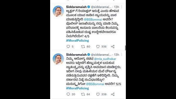 ಸಿದ್ದರಾಮಯ್ಯ ಟ್ವೀಟ್ ಮಾಡಿ, "ನಾಳೆಯಿಂದ ರಾಜ್ಯದಲ್ಲ ಹೆಣ್ಣುಮಕ್ಕಳ ಮೇಲೆ ಅನೈತಿಕ ಪೊಲೀಸ್ಗಿರಿಯನ್ನು ಯಾರೇ ನಡೆಸಲಿ, ಅವರದ್ದು ಮುಖವಾಡ ಮಾತ್ರ. ಅಸಲಿ ಮುಖ ಅಂತಹ ಕೃತ್ಯಕ್ಕೆ ಪ್ರಚೋದನೆ, ಉತ್ತೇಜನ ಮತ್ತು ರಕ್ಷಣೆ ನೀಡುವ ಕೆಲಸ ನಿಮ್ಮದು ಎಂದು ತಿಳಿದುಕೊಳ್ಳಬಹುದೇ? ಎಂದು ಸಿದ್ದರಾಮಯ್ಯ ಟ್ವೀಟ್ ಮಾಡಿದ್ದಾರೆ.