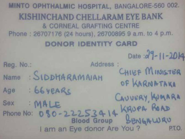 ನೇತ್ರದಾನಕ್ಕೆ ಮುಖ್ಯಮಂತ್ರಿ ಸಿದ್ದರಾಮಯ್ಯ ಒಪ್ಪಿಗೆ ಪತ್ರ