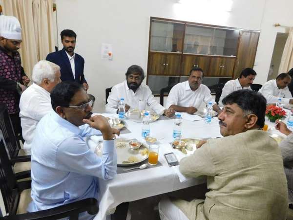 ಡಿ.ಕೆ.ಶಿವಕುಮಾರ್ ಅವರ ನಿವಾಸದಲ್ಲಿ ಬೆಳ್ಳಿ ತಟ್ಟೆಯಲ್ಲಿ ಸಚಿವರ ದೋಸೆ, ಪೊಂಗಲ್, ಕ್ಯಾರೆಟ್ ಹಲ್ವಾ ಸೇರಿದಂತೆ ವಿವಿಧ ಭಕ್ಷ್ಯಗಳನ್ನು ಸವಿದರು. ಪಕ್ಷದ ಪರವಾಗಿ ಕೆಪಿಸಿಸಿ ಕಾರ್ಯಾಧ್ಯಕ್ಷ ಈಶ್ವರ ಖಂಡ್ರೆ ಅವರು ಸಭೆಯಲ್ಲಿ ಪಾಲ್ಗೊಂಡಿದ್ದರು.