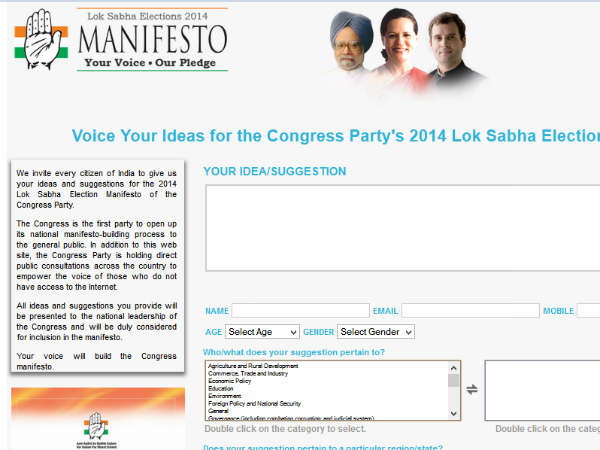 www.incmanifesto.in ವೆಬ್ ಸೈಟ್ ಗೆ ಭೇಟಿ ನೀಡುವ ಮೂಲಕ ಜನರು ಪಕ್ಷದ ಲೋಕಸಭೆ ಚುನಾವಣೆ ಪ್ರಣಾಳಿಕೆ ಹೇಗಿರಬೇಕೆಂದು ಅಭಿಪ್ರಾಯ ತಿಳಿಸಬಹುದಾಗಿದೆ. ದೇಶಕ್ಕೆ ಅಗತ್ಯವಿರುವ ಸೌಲಭ್ಯಗಳನ್ನು ಜನರು ಪಕ್ಷಕ್ಕೆ ತಿಳಿಸಬಹುದಾಗಿದೆ.
