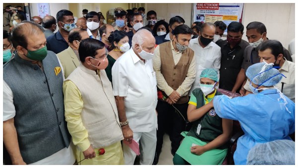 ಮುಖ್ಯಮಂತ್ರಿ ಬಿ.ಎಸ್. ಯಡಿಯೂರಪ್ಪ ಅವರು ಇಂದು ರಾಜ್ಯದ ಕೋವಿಡ್-19 ಲಸಿಕೆ ಅಭಿಯಾನಕ್ಕೆ ಚಾಲನೆ ನೀಡಿದರು. ಕೇಂದ್ರ ಕಾನೂನು ಮತ್ತು ಸಂಸದೀಯ ವ್ಯವಹಾರ ಮತ್ತು ಕಲ್ಲಿದ್ದಲು ಸಚಿವ ಪ್ರಲ್ಹಾದ ಜೋಶಿ, ರಾಜ್ಯದ ಆರೋಗ್ಯ ಮತ್ತು ಕುಟುಂಬ ಕಲ್ಯಾಣ ಹಾಗೂ ವೈದ್ಯಕೀಯ ಶಿಕ್ಷಣ ಸಚಿವ ಡಾ. ಕೆ. ಸುಧಾಕರ್, ಸಂಸದ ಪಿ.ಸಿ. ಮೋಹನ್ ಮತ್ತು ಇತರ ಗಣ್ಯರು ಉಪಸ್ಥಿತರಿದ್ದರು. ವಾರ್ಡ್ ಅಟೆಂಡೆಂಟ್ ನಾಗರತ್ನ ಅವರು ಮೊದಲ ಲಸಿಕೆ ಹಾಕಿಸಿಕೊಂಡರು.