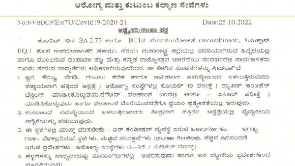 ಮಂಗಳವಾರ ಸಲಹಾ ಪತ್ರ ಹೊರಡಿಸಿರುವ ಇಲಾಖೆಯು ಕೆಲವು ಸಲಹೆಗಳನ್ನು ರಾಜ್ಯದ ಜನರಿಗೆ ನೀಡಿದೆ. ನೆರೆ ರಾಜ್ಯ ಮಹಾರಾಷ್ಟ್ರದಲ್ಲಿ ಕೋವಿಡ್ BA 2.75 ಮತ್ತು BJ.1 ಹಾಗೂ ಓಮಿಕ್ರಾನ್ ರೋಪಾಂತರ ತಳಿಯು ಪತ್ತೆಯಾಗಿದೆ. ಕರ್ನಾಟಕ, ಬೆಂಗಳೂರಿನಲ್ಲಿ ಎಚ್ಚರಿಕೆ ವಹಿಸಬೇಕಿದೆ ಎಂದು ಹೇಳಿದೆ.