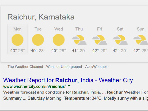 ಅಂದಹಾಗೆ ಸೋಮವಾರ ಬಿಜಾಪುರದಲ್ಲಿ ಗರಿಷ್ಠ 38 ಡಿಗ್ರಿ, ಬಳ್ಳಾರಿಯಲ್ಲಿ 39, ಕೊಪ್ಪಳದಲ್ಲಿ 36, ಗುಲ್ಬರ್ಗದಲ್ಲಿ 39, ರಾಯಚೂರಿನಲ್ಲಿ 40, ಯಾದಗಿರಿಯಲ್ಲಿ 40, ಬಾಗಲಕೋಟೆಯಲ್ಲಿ 38 ಡಿಗ್ರಿ ಗರಿಷ್ಠ ಉಷ್ಣಾಂಶವಿರಲಿದೆ ಎಂದು ಹವಮಾನ ಇಲಾಖೆ ಹೇಳಿದೆ. ಶುಕ್ರವಾರ ಮತ್ತು ಶನಿವಾರದ ವೇಳೆಗೆ ಈ ಜಿಲ್ಲೆಗಳ ಉಷ್ಣಾಂಶ 40 ಡಿಗ್ರಿಗಿಂತ ಹೆಚ್ಚು ದಾಖಲಾಗುವ ಸಾಧ್ಯತೆ ಇದೆ.