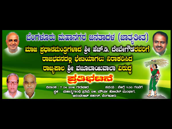 ಬೆಂಗಳೂರಿನಲ್ಲಿ ಏಪ್ರಿಲ್ 7ರಂದು ರಾಜ್ಯಪಾಲರ ವಿರುದ್ಧ ಪ್ರತಿಭಟನೆ ನಡೆಯಲಿದೆ. ಮೌರ್ಯ ಹೋಟೆಲ್ ಮುಂಭಾಗದ ಗಾಂಧಿ ಪ್ರತಿಮೆ ಬಳಿ ಬೆಳಗ್ಗೆ 11 ಗಂಟೆಗೆ ಪ್ರತಿಭಟನೆ ನಡೆಯಲಿದೆ ಎಂದು ಪಕ್ಷದ ಪ್ರಕಟಣೆಯಲ್ಲಿ ತಿಳಿಸಲಾಗಿದೆ. [ಚಿತ್ರಗಳು : ಜೆಡಿಎಸ್ ಪ್ರತಿಭಟನೆ]