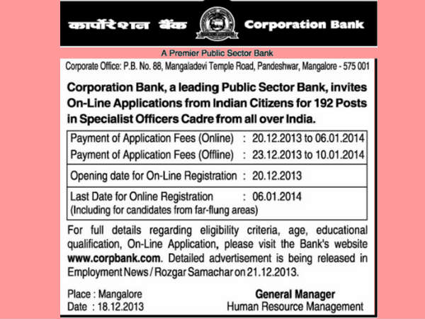 Corporation Bank of India - Specialist Officers 2014 ನೇಮಕಾತಿಯಡಿ 192 ಹುದ್ದೆಗಳನ್ನು ಭರ್ತಿ ಮಾಡಲಾಗುವುದು.