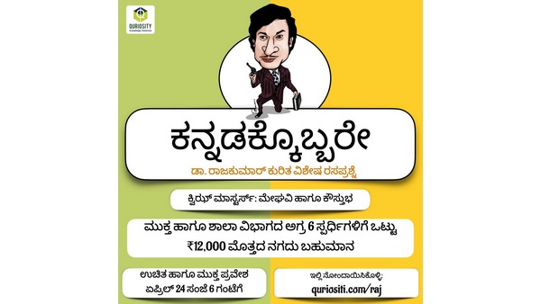 ಬೆಂಗಳೂರು ಮೂಲದ ಕ್ಯೂರಿಯಾಸಿಟಿ ಎಂಬ ಕ್ವಿಜ಼್ ಸಂಸ್ಥೆಯು 'ಕನ್ನಡಕ್ಕೊಬ್ಬರೇ' - ಡಾ. ರಾಜ್ಕುಮಾರ್ ವಿಶೇಷ ರಸಪ್ರಶ್ನೆಯನ್ನು, ಏ. 24ರಂದು ವರ್ಚುವಲ್ ಮಾದ್ಯಮದ ಮೂಲಕ ನಡೆಸುವ ಮೂಲಕ ಒಂದು ವಿನೂತನ ಪ್ರಯೋಗವನ್ನು ಮಾಡಲಿದೆ.