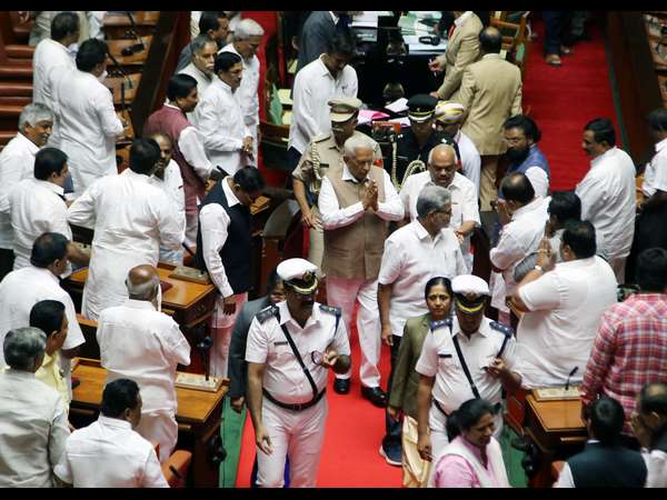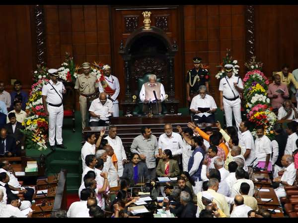 Bengaluru: Protest in Karnataka Assembly by opposition parties during Governor Vajubhai Vala's address. BJP alleged that the present government doesn't have the numbers & is a minority government. pic.twitter.com/lqbxyvsSav