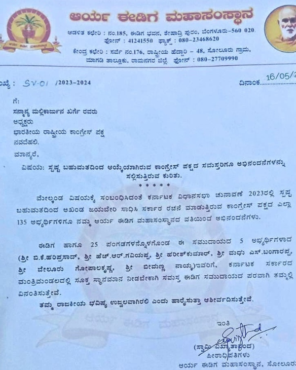 ಪರಿಷತ್ ವಿಪಕ್ಷ ನಾಯಕರಾದ ಬಿ.ಕೆ ಹರಿಪ್ರಸಾದ್, ಶಾಸಕ ಮಧು ಬಂಗಾರಪ್ಪ ಸೇರಿದಂತೆ ಬಿಲ್ಲವ-ಈಡಿಗ ಸಮದಾಯದವರಿಗೆ ಸಚಿವ ಸ್ಥಾನ ನೀಡುವಂತೆ ಶ್ರೀ ವಿಖ್ಯಾತಾನಂದ ಸ್ವಾಮೀಜಿ ಅವರು ಎಐಸಿಸಿ ಅಧ್ಯಕ್ಷರಾದ ಮಲ್ಲಿಕಾರ್ಜುನ ಖರ್ಗೆ ಅವರಿಗೆ ಪತ್ರದ ಮೂಲಕ ಮನವಿ ಮಾಡಿದ್ದಾರೆ.