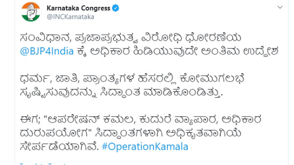 ಮಂಗಳವಾರ ಕರ್ನಾಟಕ ಕಾಂಗ್ರೆಸ್ ಅಧಿಕೃತ ಖಾತೆಯಿಂದ ಟ್ವೀಟ್ ಮಾಡಿ ಬಿಜೆಪಿ ವಿರುದ್ಧ ಆಕ್ರೋಶ ವ್ಯಕ್ತಪಡಿಸಲಾಗಿದೆ. 'ಆಪರೇಷನ್ ಕಮಲ, ಕುದುರೆ ವ್ಯಾಪಾರ, ಅಧಿಕಾರ ದುರುಪಯೋಗ ಸಿದ್ಧಾಂತಗಳಾಗಿ ಅಧಿಕೃತವಾಗಿಯೇ ಸೇರ್ಪಡೆಯಾಗಿವೆ' ಎಂದು ದೂರಿದೆ.