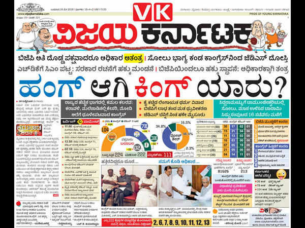 'ಹಂಗ್' ಆಗಿ ಕಿಂಗ್ ಯಾರು ಎಂಬುದು ವಿಜಯ ಕರ್ನಾಟಕ ನೀಡಿದ ಅರ್ಥವತ್ತಾದ ತಲೆಬರಹ. ಇಂದಿನ ಹೆಡ್ ಲೈನ್ ಆಫ್ ದಿ ಡೇ ವಿಜಯ ಕರ್ನಾಟಕದ್ದೇ. 'ಬಿಜೆಪಿ ಅತಿ ದೊಡ್ಡ ಪಕ್ಷವಾದರೂ ಅಧಿಕಾರ ಅತಂತ್ರ, ಸೋಲು ಭಾಗ್ಯ ಕಂಡ ಕಾಂಗ್ರೆಸ್ ನಿಂದ ಜೆಡಿಎಸ್ ದೋಸ್ತಿ, ಎಚ್ ಡಿಕೆಗೆ ಸಿಎಂ ಪಟ್ಟ, ಸರ್ಕಾರ ರಚನೆಗೆ ಹಕ್ಕು ಮಂಡನೆ, ಬಿಜೆಪಿಯಿಂದಲೂ ಹಕ್ಕು ಸ್ಥಾಪನೆ: ಅಧಿಕಾರಕ್ಕಾಗಿ ತಂತ್ರ.' ಫಲಿತಾಂಶವನ್ನು ವಿಜಯ ಕರ್ನಾಟಕ ಪತ್ರಿಕೆ ವಿವರಿಸಿದ್ದು ಹೀಗೆ.