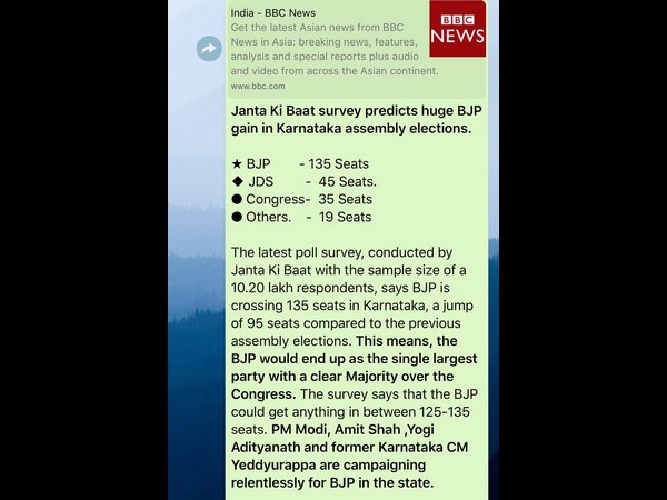 ಬಿಬಿಸಿಯ ಅಧಿಕೃತ ಲೋಗೋ ಬಳಸಿದ್ದ ಈ ಸುದ್ದಿಯನ್ನು ಸಾಕಷ್ಟು ಜನ ಸಾಮಾಜಿಕ ಮಾಧ್ಯಮಗಳಲ್ಲಿ ಶೇರ್ ಮಾಡಿದ್ದರು. 'ಜನತಾ ಕಿ ಬಾತ್' ಹೆಸರಿನಲ್ಲಿ ಸುಮಾರು 10.20 ಲಕ್ಷ ಜನರ ಬಳಿ ನಡೆಸಿದ ಸಮೀಕ್ಷೆಯಲ್ಲಿ ಬಿಜೆಪಿ 2013 ರ ಚುನಾವಣೆಗಿಂತ 95 ಸ್ಥಾನ ಹೆಚ್ಚು ಗಳಿಸಿ, ಬಹುಮತ ಪಡೆಯಲಿದೆ. ಸ್ಪಷ್ಟ ಬಹುಮತ ಪಡೆಯುವ ಬಿಜೆಪಿ ಅಧಿಕಾರಕ್ಕೆ ಬರಲಿದೆ. ಪ್ರಧಾನಿ ನರೇಂದ್ರ ಮೋದಿ, ಬಿಜೆಪಿ ರಾಷ್ಟ್ರಾಧ್ಯಕ್ಷ ಅಮಿತ್ ಶಾ, ಉತ್ತರ ಪ್ರದೇಶ ಮುಖ್ಯಮಂತ್ರಿ ಯೋಗಿ ಆದಿತ್ಯನಾಥ್, ಮಾಜಿ ಮುಖ್ಯಮಂತ್ರಿ ಬಿ ಎಸ್ ಯಡಿಯೂರಪ್ಪ ಮುಂತಾದವರು ಚುನಾವಣೆಗೂ ಮುನ್ನ ನಡೆಸಿದ ಪ್ರಚಾರಗಳು ಬಿಜೆಪಿಗೆ 125-135 ಸ್ಥಾನ ಗಳಿಸಿಕೊಡಲಿವೆ ಎಂದು ಈ ಸಂದೇಶದಲ್ಲಿ ಹೇಳಲಾಗಿತ್ತು!
