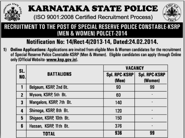ವಯೋಮಿತಿ ಸಾಮಾನ್ಯ ವರ್ಗಕ್ಕೆ 18 ರಿಂದ 25 ವರ್ಷ. ಮೀಸಲಾತಿಯನ್ವಯ ರಿಯಾಯಿತಿಯೂ ಇರುತ್ತದೆ. ಶೈಕ್ಷಣಿಕ ಅರ್ಹತೆ- ಎಸ್ಎಸ್ಎಲ್ ಸಿ ಪಾಸಾಗಿರಬೇಕು. ಗಮನಿಸಿ, ಆನ್ ಲೈನ್ ಮೂಲಕವಷ್ಟೇ ಅರ್ಜಿ ಸಲ್ಲಿಸಬೇಕಾಗಿದೆ. ಅರ್ಜಿ ಸಲ್ಲಿಸಲು ಕೊನೆಯ ದಿನಾಂಕ ಮಾರ್ಚ್ 30, 2014. ಬೆಳಗಾವಿ, ಮೈಸೂರು, ಮಂಗಳೂರು, ಶಿವಮೊಗ್ಗ, ಶಿಗ್ಗಾಂವ್ ಮತ್ತು ಹಾಸನ KSRP ಬೆಟಾಲಿಯನ್ ಗಳಿಗೆ ಈ ನೇಮಕಾತಿ ನಡೆಯುತ್ತಿದೆ.
