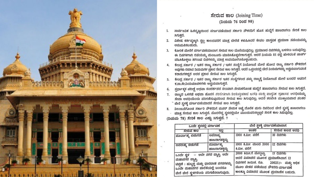 ಬೆಂಗಳೂರು , ಜುಲೈ 08: ಕರ್ನಾಟಕದ ಸರ್ಕಾರಿ ನೌಕರರು ಕಾಲ ಕಾಲಕ್ಕೆ ಬಡ್ತಿ, ವರ್ಗಾವಣೆಗೆ ಒಳಪಡುತ್ತಾರೆ. ವರ್ಗಾವಣೆಗೊಂಡಾಗ ಪ್ರತಿ ನೌಕರನಿಗೆ ಸೇರಿಕೆ ಕಾಲ (Joining Time) ಲಭ್ಯವಾಗುತ್ತದೆ. ಈ ಸೇರಿಕೆ ಕಾಲ ಹೇಗೆ ಸಿಗುತ್ತದೆ?, ನಿಯಮಗಳೇನು?, ಎಷ್ಟು ದಿನ ಮುಂತಾದ ಮಾಹಿತಿಗಳನ್ನು ಸರ್ಕಾರಿ ನೌಕರರ ಉಪಯುಕ್ತ ಮಾಹಿತಿಗಾಗಿ ಹಂಚಿಕೊಳ್ಳಲಾಗಿದೆ.