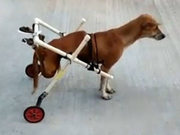 ನಾಯಿಯ ಹೊಟ್ಟೆಯ ಭಾಗಕ್ಕೆ ಪೈಪ್ ಜೋಡಿಸಿ ಅದಕ್ಕೆ ಚಕ್ರ ಕೂರಿಸಲಾಗಿದೆ. ಇದಕ್ಕೆ ಒಟ್ಟು 800 ರೂಪಾಯಿ ಖರ್ಚು ತಗುಲಿದೆ.