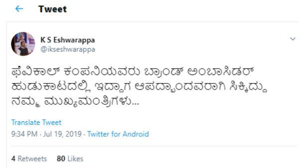 ಕೆ. ಎಸ್. ಈಶ್ವರಪ್ಪ ಅವರು ಟ್ವೀಟ್ ಮೂಲಕ ಮುಖ್ಯಮಂತ್ರಿಗಳ ಕಾಲೆಳೆದಿದ್ದಾರೆ. "ಫೆವಿಕಾಲ್ ಕಂಪನಿಯವರು ಬ್ರಾಂಡ್ ಅಂಬಾಸಿಡರ್ ಹುಡುಕಾಟದಲ್ಲಿ ಇದ್ದಾಗ ಆಪದ್ಭಾಂದವರಾಗಿ ಸಿಕ್ಕಿದ್ದು ನಮ್ಮ ಮುಖ್ಯಮಂತ್ರಿಗಳು" ಎಂದು ಟೀಕಿಸಿದ್ದಾರೆ.