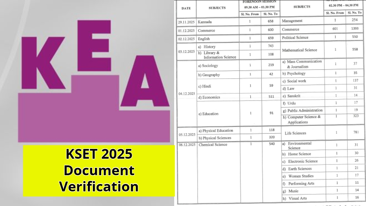 KSET 2025ರ ತಾತ್ಕಾಲಿಕ ಅರ್ಹತಾ ಪಟ್ಟಿಯಲ್ಲಿ ಹೆಸರು ಇರುವ ಅಭ್ಯರ್ಥಿಗಳ ಮೂಲ ದಾಖಲೆಗಳ ಪರಿಶೀಲನೆಯು ಇದೇ ನವೆಂಬರ್ 29ರಿಂದ ಡಿಸೆಂಬರ್ 6ರ ವರೆಗೆ ಪ್ರಾಧಿಕಾರದ ಕಚೇರಿಯಲ್ಲಿ ನಡೆಯಲಿದೆ. ಒಂದೊಂದು ವಿಷಯಕ್ಕೆ ಒಂದೊಂದು ದಿನ ನಿಗದಿ ಮಾಡಿದ್ದು, ಆ ಪ್ರಕಾರ ಅರ್ಹ ಅಭ್ಯರ್ಥಿಗಳ ಪರಿಶೀಲನೆಗೆ ಬರಬೇಕು ಎಂದು ಕರ್ನಾಟಕ ಪರೀಕ್ಷಾ ಪ್ರಾಧಿಕಾರ (KEA) ಕಾರ್ಯನಿರ್ವಾಹಕ ನಿರ್ದೇಶಕ ಎಚ್. ಪ್ರಸನ್ನ ಅವರು ತಿಳಿಸಿದ್ದಾರೆ.