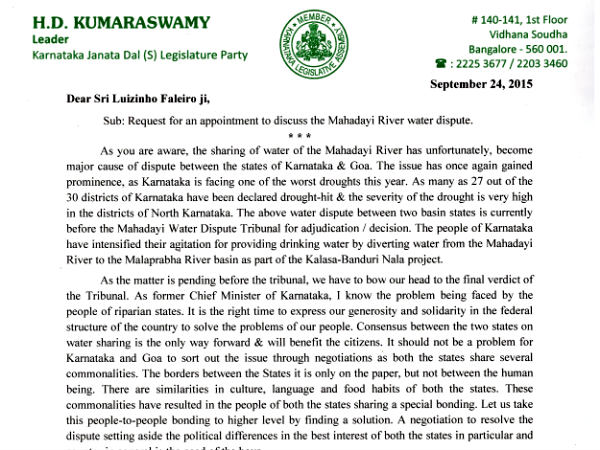 ಕಳಸಾ-ಬಂಡೂರಿ ಕುಡಿಯುವ ನದಿ ನೀರು ಯೋಜನೆ ಅನುಷ್ಠಾನ ಹಾಗೂ ಮಹದಾಯಿ ನದಿ ನೀರು ಬಿಕ್ಕಟ್ಟಿನ ಬಗ್ಗೆ ಚರ್ಚೆ ನಡೆಸಲು ಸಮಯ ನಿಗದಿಪಡಿಸಬೇಕೆಂದು ಜೆಡಿಎಸ್ ರಾಜ್ಯಾಧ್ಯಕ್ಷ ಎಚ್.ಡಿ.ಕುಮಾರಸ್ವಾಮಿ ಅವರು ಗೋವಾದ ವಿರೋಧ ಪಕ್ಷದ ನಾಯಕರು ಹಾಗೂ ಕಾಂಗ್ರೆಸ್ ಸಮಿತಿ ಅಧ್ಯಕ್ಷರಿಗೆ ಪತ್ರ ಬರೆದಿದ್ದಾರೆ.[ಕಳಸಾ-ಬಂಡೂರಿ ಹೋರಾಟಕ್ಕೆ ಕೈ ಜೋಡಿಸಿದ ಕರ್ನಾಟಕ]