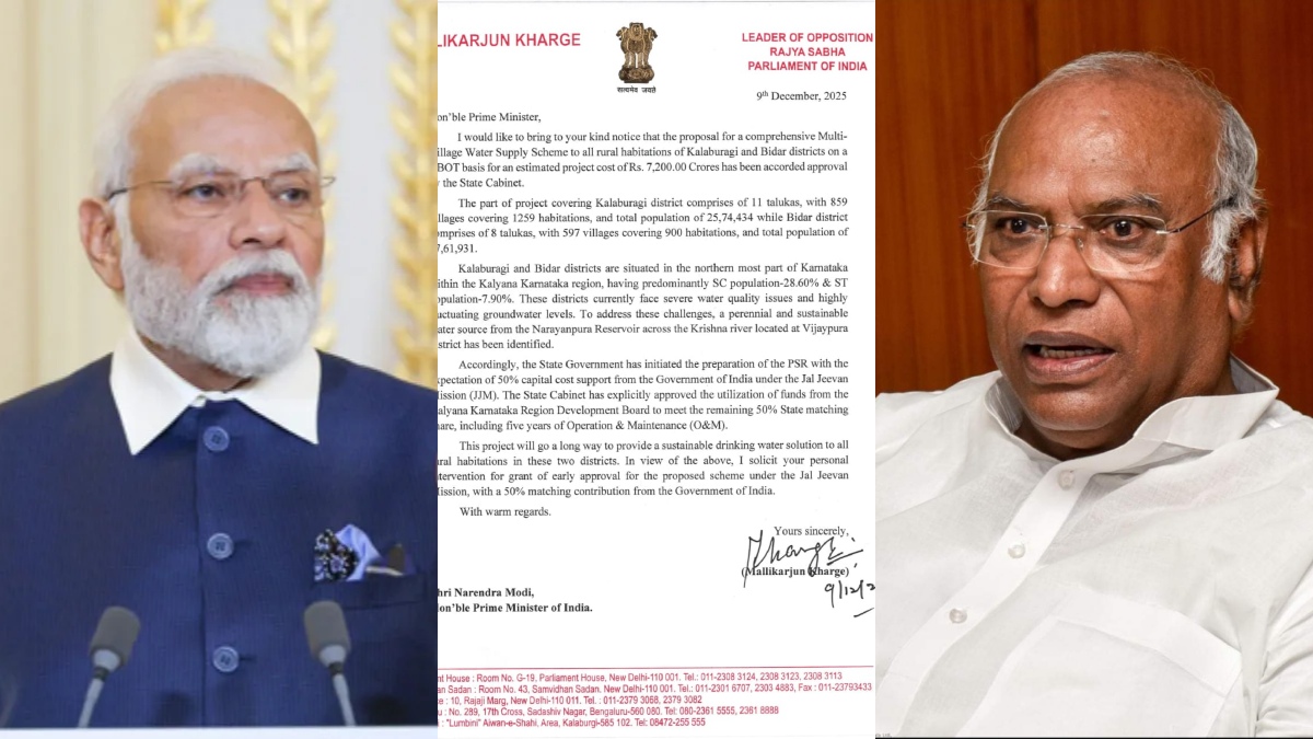 ಬೆಂಗಳೂರು, ಡಿಸೆಂಬರ್ 11: ಕಲಬುರಗಿ ಹಾಗೂ ಬೀದರ್ ಜಿಲ್ಲೆಗಳ ಸಮಗ್ರ ಬಹುಗ್ರಾಮ ಕುಡಿಯುವ ನೀರು ಒದಗಿಸುವ ಯೋಜನೆಗಾಗಿ ಅನುಮೋದನೆ ಹಾಗೂ ಜಲ್ ಜೀವನ್ ಮೀಷನ್ ಯೋಜನೆಯಡಿಯಲ್ಲಿ 50% ಕೇಂದ್ರ ಸರ್ಕಾರದ ಹೊಂದಾಣಿಕೆ ಅನುದಾನ ಬಿಡುಗಡೆ ಮಾಡುವಂತೆ ಪ್ರಧಾನ ಮಂತ್ರಿ ನರೇಂದ್ರ ಮೋದಿ ಅವರಿಗೆ ರಾಜ್ಯಸಭೆ ವಿರೋಧ ಪಕ್ಷದ ನಾಯಕರಾದ ಮಲ್ಲಿಕಾರ್ಜುನ ಖರ್ಗೆ ಪತ್ರ ಬರೆದಿದ್ದಾರೆ.