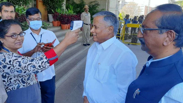 ಬಿಬಿಎಂಪಿ ಮತ್ತು ವಿಧಾನಸೌಧದ ಸಿಬ್ಬಂದಿ ಶಾಸಕರನ್ನು ತಪಾಸಣೆ ನಡೆಸುತ್ತಿದ್ದಾರೆ. ಬುಧವಾರ ಬೆಳಗ್ಗೆ ವಸತಿ ಸಚಿವ ವಿ. ಸೋಮಣ್ಣ ಅವರನ್ನು ಸಿಬ್ಬಂದಿ ತಪಾಸಣೆ ಮಾಡಿದರು. ಬಿಬಿಎಂಪಿ ಆಯುಕ್ತ ಬಿ. ಎಚ್. ಅನಿಲ್ ಕುಮಾರ್ ಈ ಸಂದರ್ಭದಲ್ಲಿ ಜೊತೆಗಿದ್ದರು.