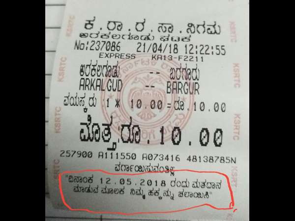 ಸಾಮಾನ್ಯವಾಗಿ ನಗರ ಸೇರಿದಂತೆ ಅನೇಕ ಜಿಲ್ಲೆ, ಹಳ್ಳಿಗಳಿಗೆ ಕೆ.ಎಸ್.ಆರ್ ಟಿಸಿ ಬಸ್ ಗಳು ತೆರಳುತ್ತವೆ. ಕೆಲವೊಂದು ಹಳ್ಳಿಗಳಲ್ಲಿ ಕೆಎಸ್ ಆರ್ ಟಿಸಿ ಬಸ್ ಮಾತ್ರವೇ ತೆರಳುವ ಉದಾಹರಣೆಯೂ ಇದೆ. ಹಾಗಾಗಿ ನಾಗರಿಕರಲ್ಲಿ ಮತದಾನ ಮೂಡಿಸಲು ಟಿಕೆಟ್ ಮೇಲೆ ಮೇ.12ರಂದು ಮತದಾನ ನಡೆಯಲಿದೆ. ಮತದಾನ ಮೂಲಕ ನಿಮ್ಮ ಹಕ್ಕನ್ನು ಚಲಾಯಿಸಿ ಎಂದು ಬರೆಯಲಾಗಿದೆ.